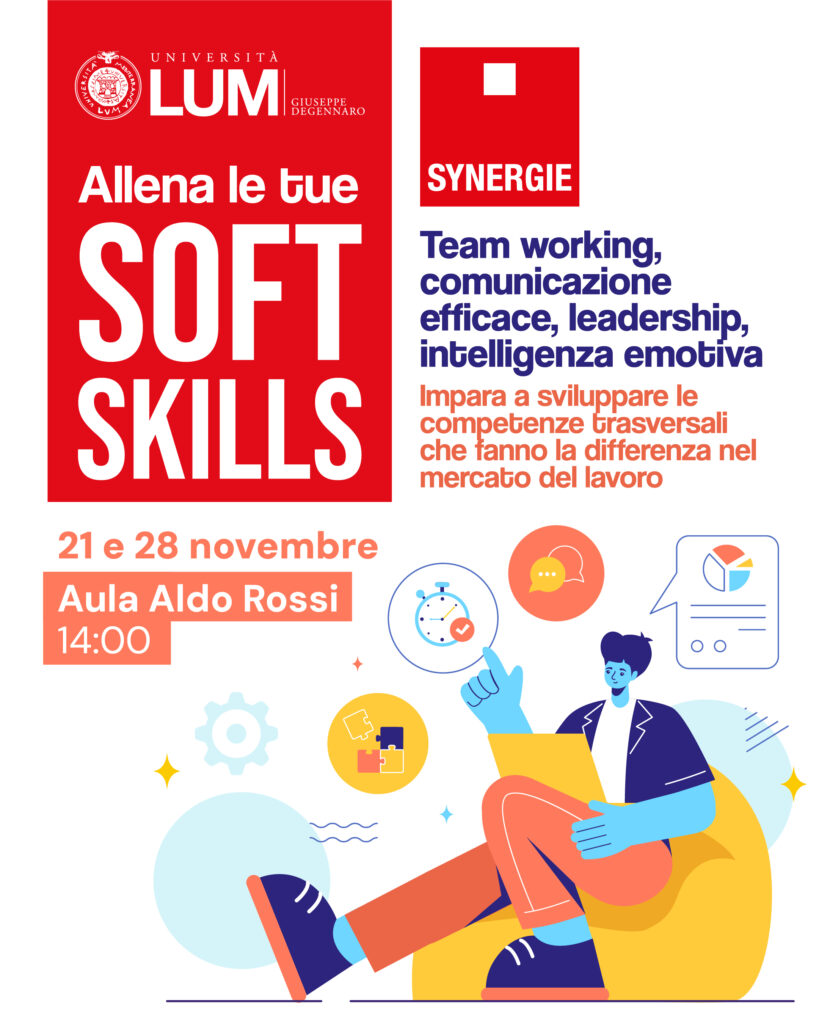 Team working, comunicazione efficace, leadership e intelligenza emotiva sono oggi competenze fondamentali per affrontare con successo il mondo del lavoro. L’Università LUM Giuseppe Degennaro, in collaborazione con Synergie Italia – Agenzia per il lavoro S.p.A., organizza due incontri formativi dedicati allo sviluppo delle soft skills, le abilità trasversali più richieste dalle aziende.