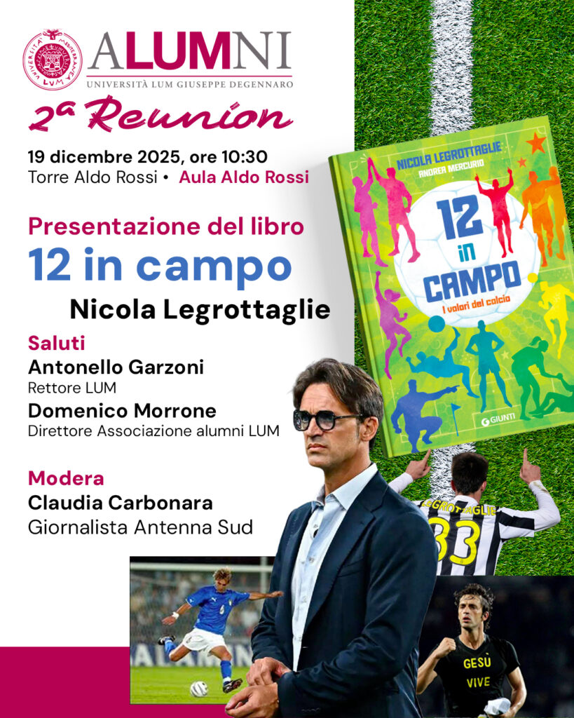 Venerdì 19 dicembre 2025, alle ore 10:30, presso l’Aula Aldo Rossi della Torre Aldo Rossi, si terrà la presentazione del libro “12 in campo. I valori del calcio” di Nicola Legrottaglie.