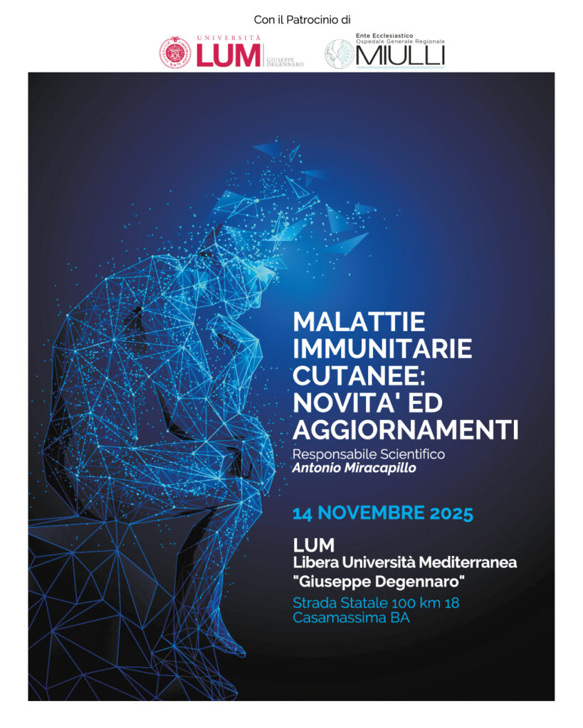 Si terrà il 14 novembre 2025 presso l’Università LUM Giuseppe Degennaro il Congresso dedicato alle innovazioni in ambito dermatologico, reumatologico ed endocrinologico, un’importante occasione di confronto tra clinici, ricercatori e specialisti del settore.