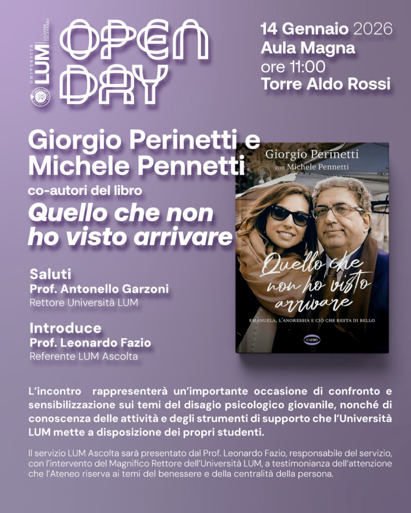 Mercoledì 14 gennaio 2026, alle ore 11.00, presso l’Aula Magna della Torre Aldo Rossi, l’Università LUM Giuseppe Degennaro ospiterà un nuovo appuntamento di Open Day con Giorgio Perinetti e Michele Pennetti, co-autori del libro Quello che non ho visto arrivare.
