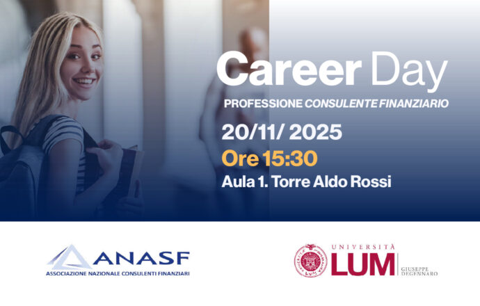 L’Università LUM Giuseppe Degennaro organizza il Career Day – Professione Consulente Finanziario, un appuntamento dedicato agli studenti interessati a conoscere da vicino le opportunità professionali nell’ambito della consulenza finanziaria.
