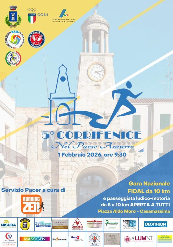 Domenica 1 febbraio 2026, a partire dalle ore 9:30, Casamassima ospiterà la 5ª edizione della Corrifenice – Nel Paese Azzurro, appuntamento sportivo ormai consolidato nel panorama podistico nazionale.