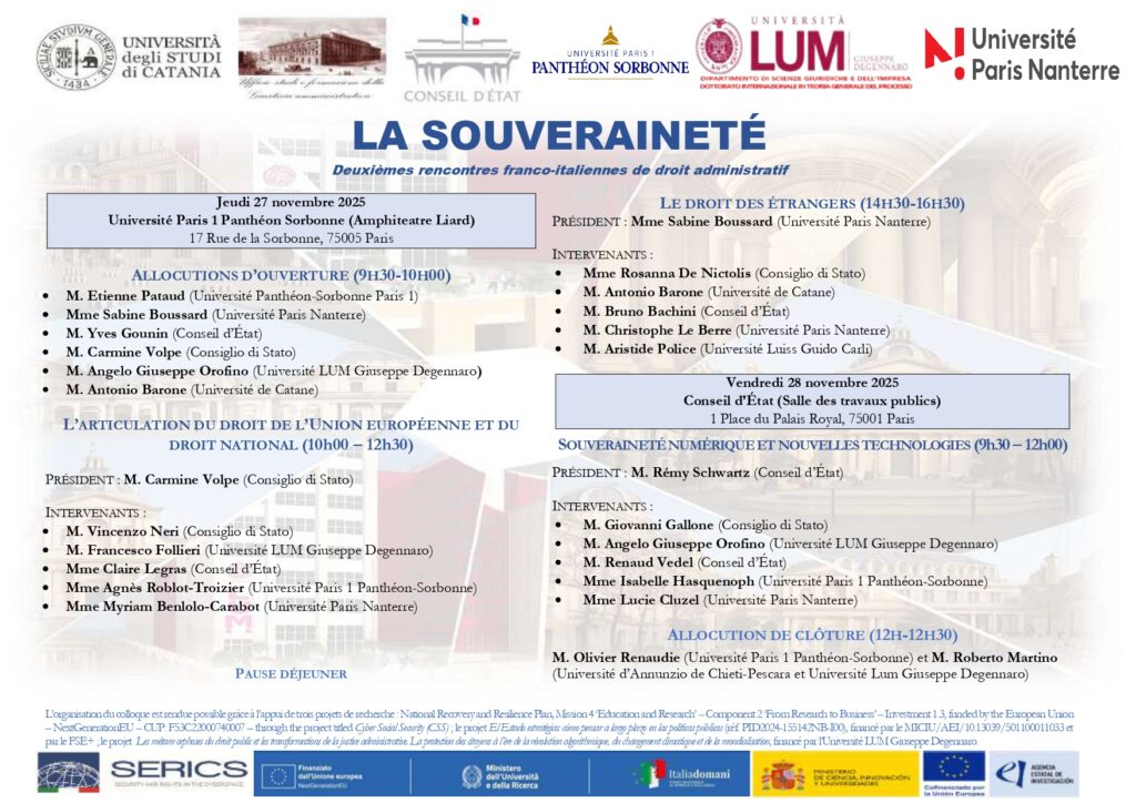 L’Università LUM Giuseppe Degennaro parteciperà al convegno internazionale “La Souveraineté” – Les Deuxièmes rencontres franco-italiennes de droit administratif, che si terrà a Parigi il 27 e 28 novembre 2025, presso la Sorbonne – Université Paris 1 Panthéon-Sorbonne e il Conseil d’État.