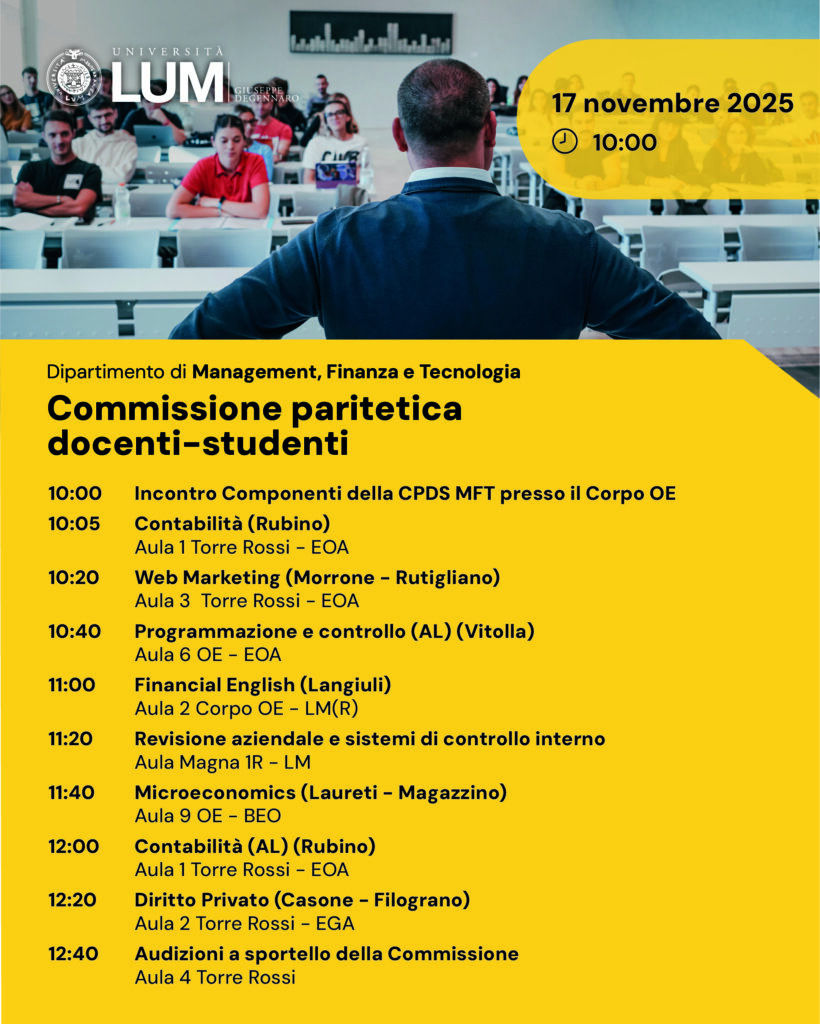 Lunedì 17 novembre dalle ore 10 si riunirà la Commissione Paritetica Docenti Studenti del Dipartimento di Management Finanza e Tecnologia per raccogliere dagli studenti informazioni in merito all’andamento dell’attività didattica, e condividere eventuali problematiche, criticità e per definire congiuntamente eventuali azioni di miglioramento.