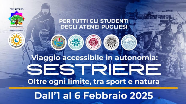 Nell’ambito del progetto “RotteVariabili, servizi inclusivi per studenti universitari”, finanziato da A.D.I.S.U. Puglia e promosso dalla cooperazione sociale è possibile prendere parte a un nuovo viaggio accessibile e in autonomia con RotteVaribili. Una settimana immersi nella natura e nella neve per respirare a pieni polmoni l’aria pura sulle vette alpine della meravigliosa Sestriere e provare l’indimenticabile esperienza dello sci, dall’1 al 6 febbraio 2025.
