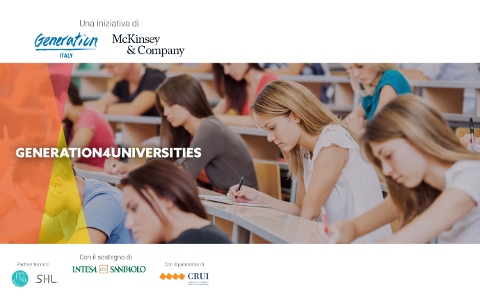 Generation4Universities è un’iniziativa promossa dalla Fondazione Generation Italy e McKinsey & Company, con il sostegno di Intesa Sanpaolo, con la partnership tecnica di Mentors4U e SHL, con il patrocinio della Conferenza dei Rettori delle Università Italiane (CRUI) e il supporto di un gruppo di aziende partner di primario livello. L’iniziativa è rivolta a giovani universitari di talento, il cui potenziale sviluppo di carriera è limitato da elementi esterni diversi dalle proprie capacità, per aiutarli ad esprimere il proprio valore e avviare una carriera che rappresenti un’occasione di crescita professionale e personale.