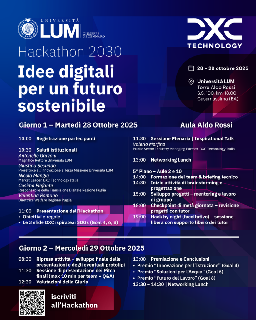 La Puglia torna al centro dell’innovazione digitale, grazie a Hackathon2030, l’evento promosso da DXC Technology, una delle principali società di servizi tecnologici globali, parte delle Fortune 500, in collaborazione con l’Università LUM Giuseppe Degennaro, giunto quest’anno alla sua quarta edizione.