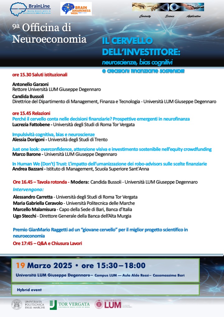 Giovedì 19 marzo 2025, dalle 15.30 alle 18.00, presso l’Aula Aldo Rossi del Campus dell’Università LUM “Giuseppe Degennaro”, si terrà la 9ª Officina di Neuroeconomia, dal titolo “Il cervello dell’investitore: neuroscienze, bias cognitivi e decisioni finanziarie sostenibili”. L’iniziativa si svolgerà in modalità ibrida e rientra nell’ambito delle attività di approfondimento dedicate alle intersezioni tra neuroscienze, economia comportamentale e finanza.