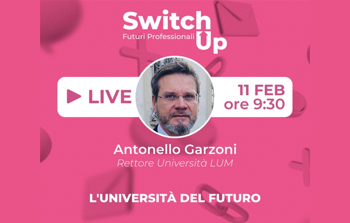 Il Rettore della LUM, prof. Antonello Garzoni, venerdì 11 febbraio alle ore 9.30 sarà ospite in diretta Youtube della trasmissione Rinascita Digitale-Switch up, un focus particolare sui temi che ci vedono tutti coinvolti come persone e professionisti in quest’epoca di continui cambiamenti. Si parlerà di occupabilità, eterogeneità dei team, crescita personale, formazione e lavoro, attraverso il contributo di ospiti, news e interessanti case history. Tema della puntata: L’università del futuro, i nuovi modelli e le esigenze negli incontri tra le aziende e i processi culturali. A che punto siamo?