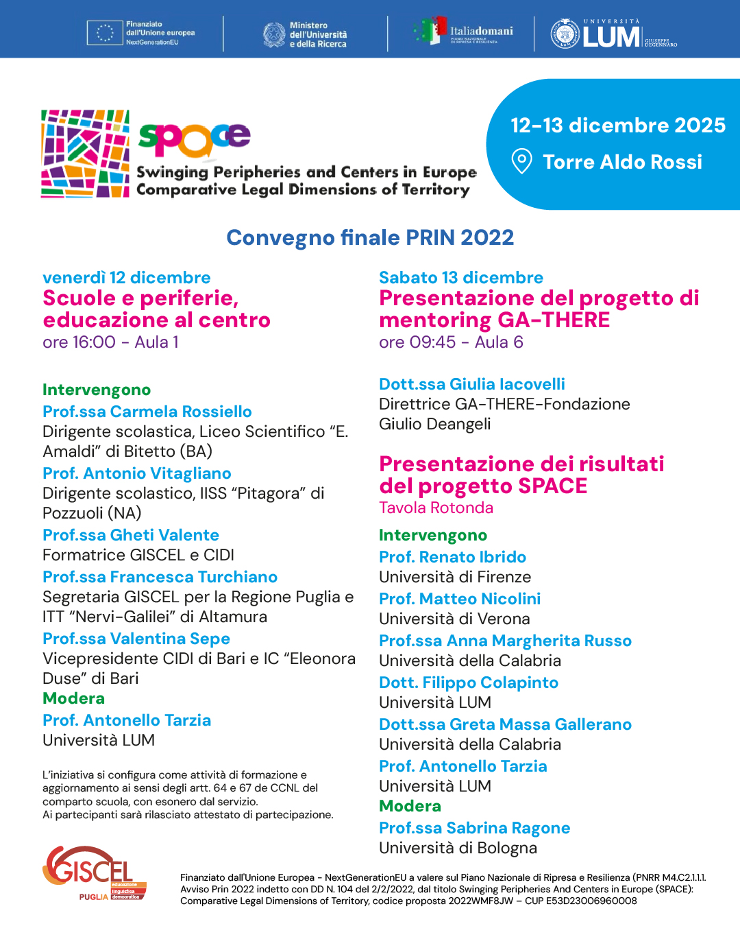 A seguire, una tavola rotonda sarà dedicata ai risultati del progetto SPACE, con interventi dei docenti Renato Ibrido, Matteo Nicolini, Anna Margherita Russo, Filippo Colapinto, Greta Massa Gallerano e Antonello Tarzia.