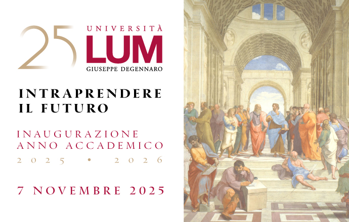 La Cerimonia di Inaugurazione dell’Anno Accademico 2025/2026 dell’Università LUM “Giuseppe Degennaro” si terrà venerdì 7 novembre 2025 alle ore 10.30, presso la nuova Aula Magna della Torre Rossi.