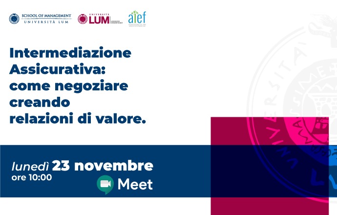 Intermediazione Assicurativa: come negoziare creando relazioni di valore è il titolo di un webinar in programma lunedì 23 novembre alle ore 10 sulla piattaforma Meet della nostra Università.