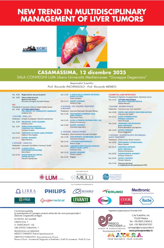 Si svolgerà il 12 dicembre 2025, presso la Sala Convegni della LUM “Giuseppe Degennaro” a Casamassima, il convegno “New Trend in Multidisciplinary Management of Liver Tumors”, appuntamento dedicato agli aggiornamenti clinici e ai più recenti approcci multidisciplinari nel trattamento dei tumori epatici.