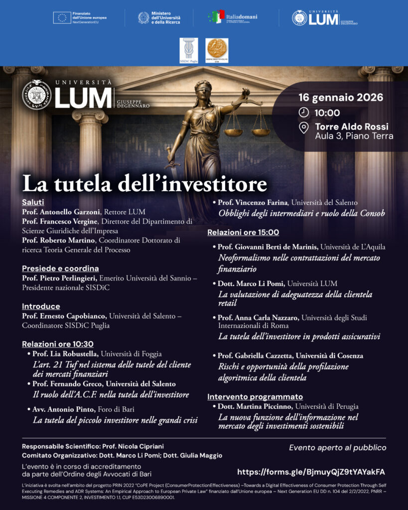 Venerdì 16 gennaio 2026, a partire dalle ore 10.00, l’Università LUM Giuseppe Degennaro ospiterà il convegno “La tutela dell’investitore”, presso la Torre Aldo Rossi – Aula 3 (piano terra).