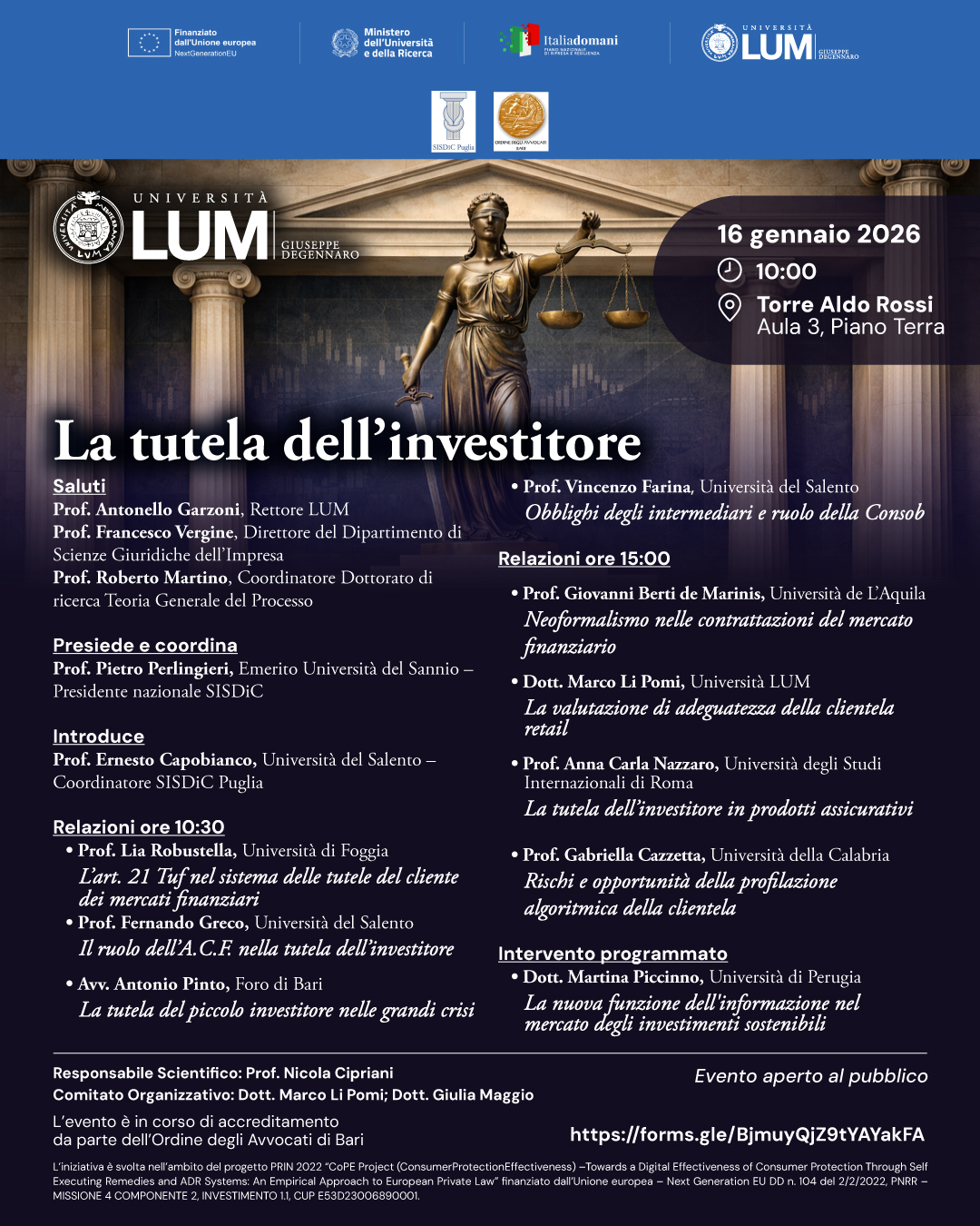 Venerdì 16 gennaio 2026, a partire dalle ore 10.00, l’Università LUM Giuseppe Degennaro ospiterà il convegno “La tutela dell’investitore”, presso la Torre Aldo Rossi – Aula 3 (piano terra).