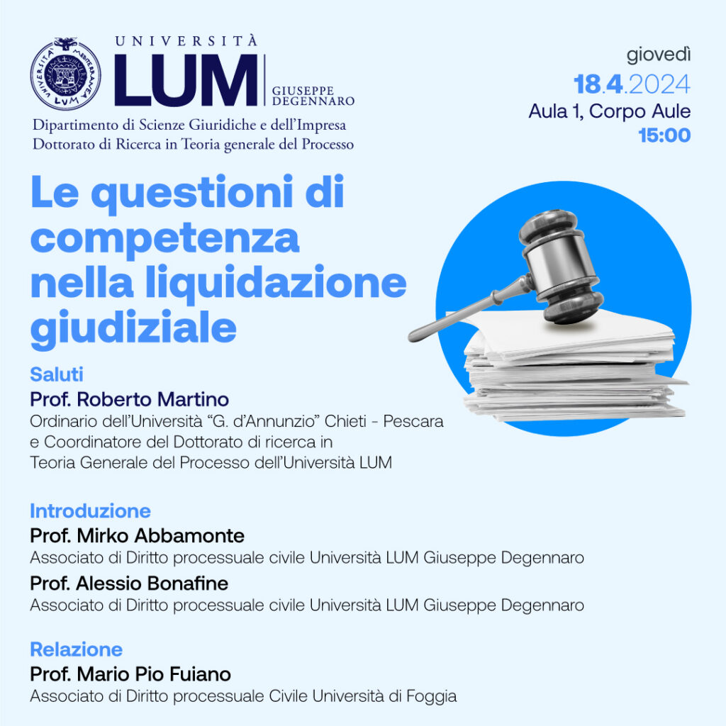 “Le questioni di competenza nella liquidazione giudiziale” è il titolo del seminario organizzato dal Dipartimento di Scienze Giuridiche e dell’Impresa nell’ambito del Dottorato in Teoria Generale del Processo. L’appuntamento è per giovedì 18 aprile – Aula 1 Facoltà alle ore 15:00. Dopo gli indirizzi di saluto del Prof. Roberto Martino, Ordinario di Diritto processuale civile nell’Università “G. d’Annunzio” Chieti-Pescara e Coordinatore del Dottorato di ricerca in Teoria Generale del Processo dell’Università LUM, e l’introduzione dei proff. Mirko Abbamonte e Alessio Bonafine, Associati di Diritto processuale civile nell’Università LUM, è prevista la relazione del Prof. Mario Pio Fuiano, Associato di Diritto processuale civile nell’Università di Foggia.