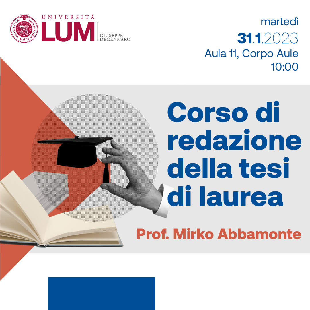 Nell’ambito delle attività di orientamento in itinere è in programma martedì 31 gennaio in aula 11 dalle ore 10:00 alle ore 13:00 un Corso per la redazione della  Tesi di laurea. L’incontro riservato agli studenti del Dipartimento di Scienze Giuridiche e dell’Impresa sarà tenuto da Mirko Abbamonte, Professore Associato di Diritto Processuale Civile.