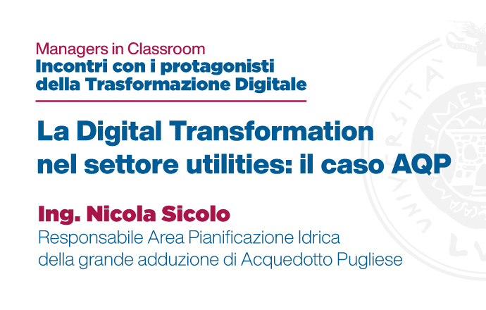 L’incontro sarà introdotto dalla prof.ssa Giustina Secundo, delegata del rettore all’innovazione e terza missione e dal dott. Pietro Scrimeri, Direttore Risorse umane ed organizzazione di Acquedotto Pugliese. In programma l’open lesson dal titolo La Digital Transformation nel settore utilities: il caso AQP, tenuta dall’ing. Nicola Sicolo, Responsabile Area Pianificazione Idrica della grande adduzione di Acquedotto Pugliese