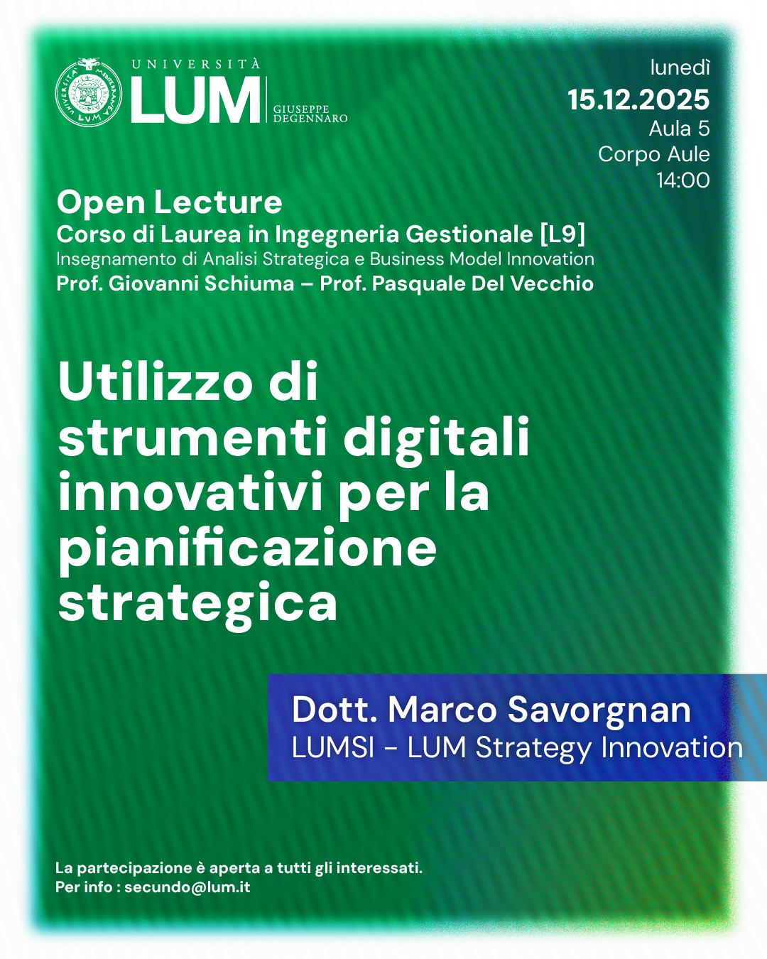 Il 15 dicembre 2025 alle ore 14.00, presso l’Aula 5 del Corpo Aule dell’Università LUM, si terrà l’Open Lecture dal titolo “Utilizzo di strumenti digitali innovativi per la pianificazione strategica”, organizzata nell’ambito del Corso di Analisi Strategica e Business Model Innovation del Corso di Laurea Triennale in Ingegneria Gestionale – L9.
