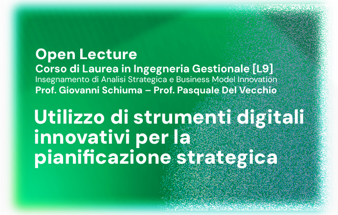 La lezione offrirà agli studenti una panoramica operativa sull’impiego di strumenti digitali avanzati a supporto dei processi di pianificazione strategica e innovazione dei modelli di business, con esempi applicativi e metodologie utilizzate nelle organizzazioni contemporanee.