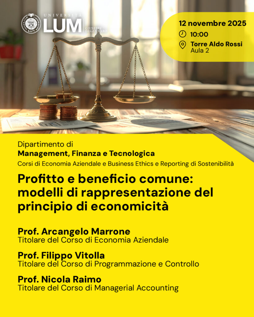 Il Dipartimento di Management, Finanza e Tecnologia dell’Università LUM organizza un incontro dedicato al tema del Profitto e beneficio comune: modelli di rappresentazione del principio di economicità. L’appuntamento, rivolto agli studenti dei corsi di Economia Aziendale e Business Ethics & Reporting di Sostenibilità, approfondisce i modelli di rappresentazione del valore economico e sociale d’impresa.