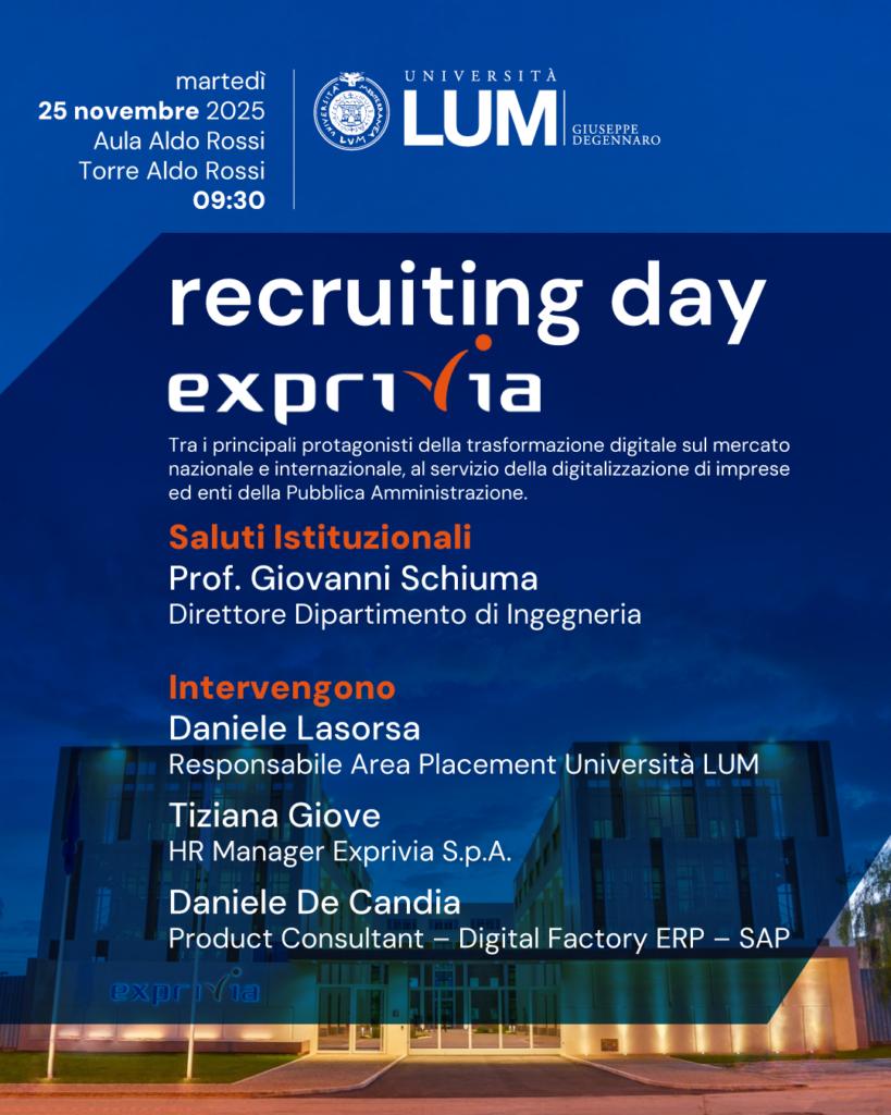 Martedì 25 novembre 2025, alle ore 09:30 presso l’Aula Aldo Rossi della Torre Aldo Rossi, l’Università LUM Giuseppe Degennaro ospiterà il Recruiting Day Exprivia, una mattinata dedicata all’incontro tra studenti, neolaureati e una delle principali realtà italiane nel settore della trasformazione digitale.