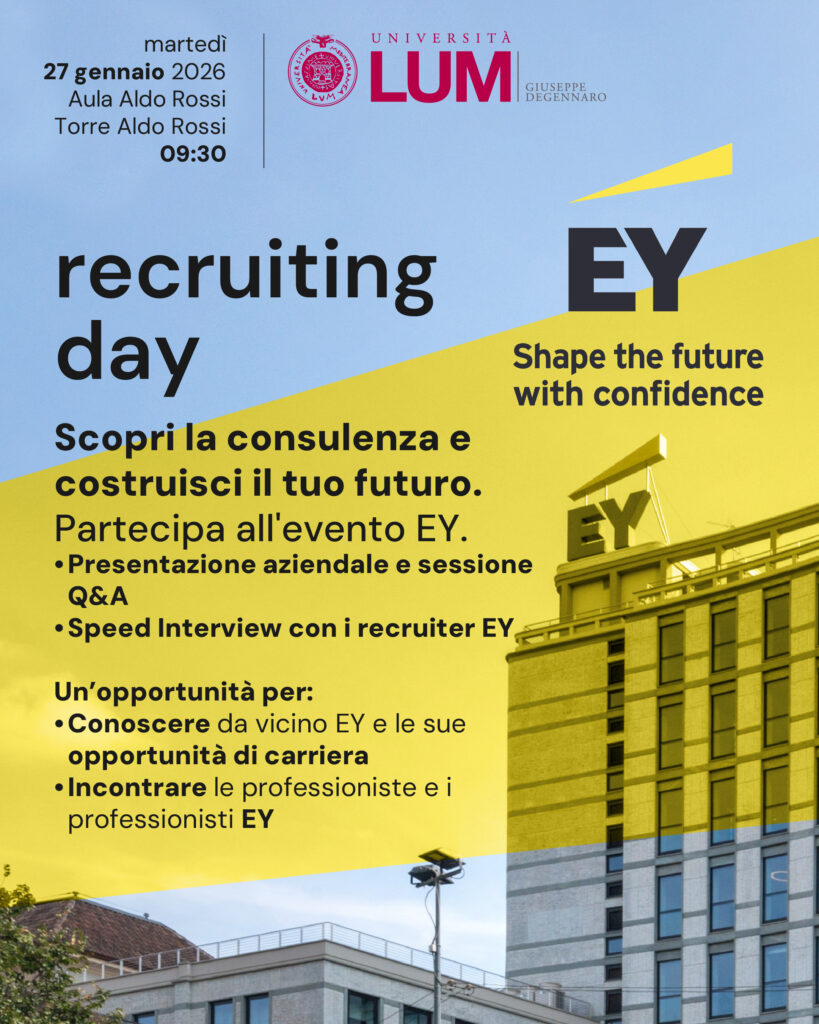 Martedì 27 gennaio 2026, a partire dalle ore 9:30, l’Università LUM Giuseppe Degennaro ospiterà il Recruiting Day EY, un’importante occasione di incontro tra studenti e mondo della consulenza.