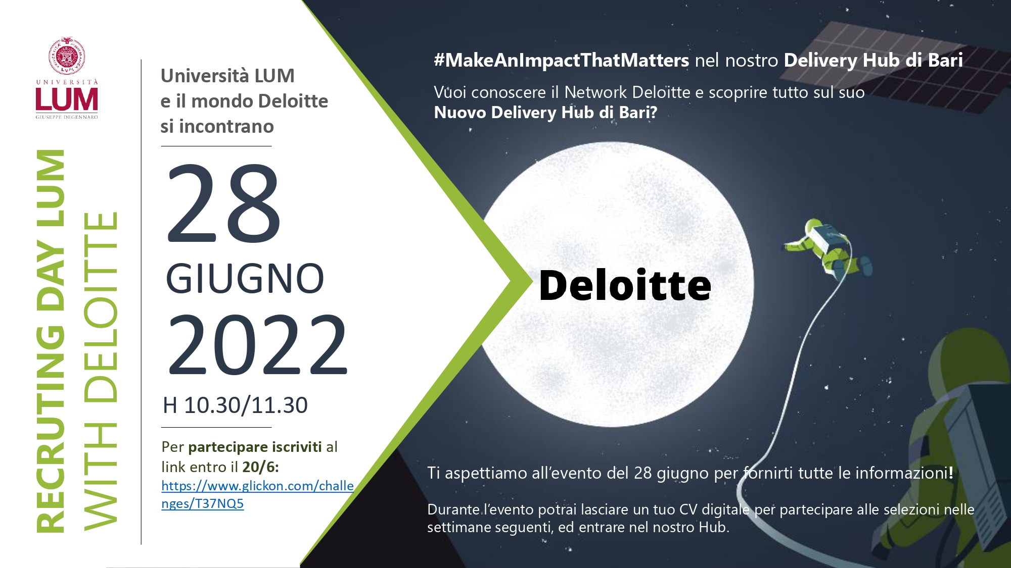 L’Università LUM e il mondo Deloitte si incontreranno nel corso di un Recruiting Day in programma martedì 28 giugno alle ore 10.30. Durante l’evento gli studenti potranno lasciare il CV digitale per partecipare alle selezioni nelle settimane seguenti, ed entrare nel Delivery Hub.