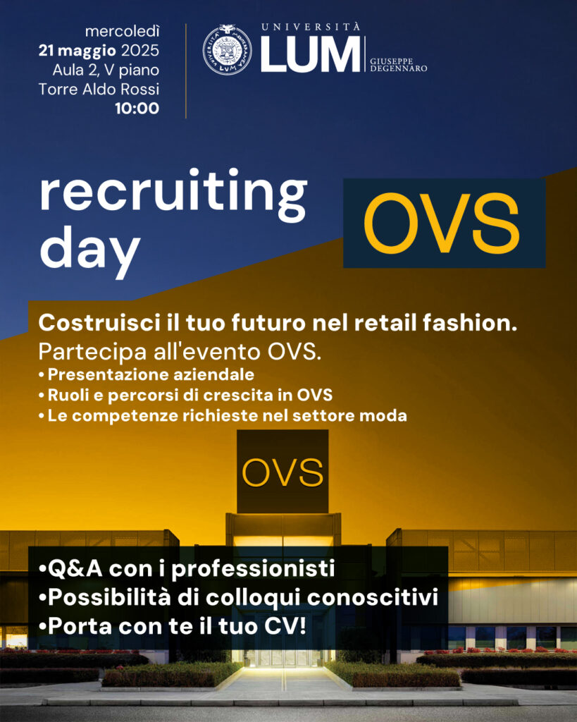 Mercoledì 21 maggio 2025, alle ore 10:00 presso l’Aula 2, V piano della Torre Aldo Rossi, l’Università LUM ospiterà il Recruting Day OVS, un’importante occasione per avvicinarsi al mondo del retail fashion.