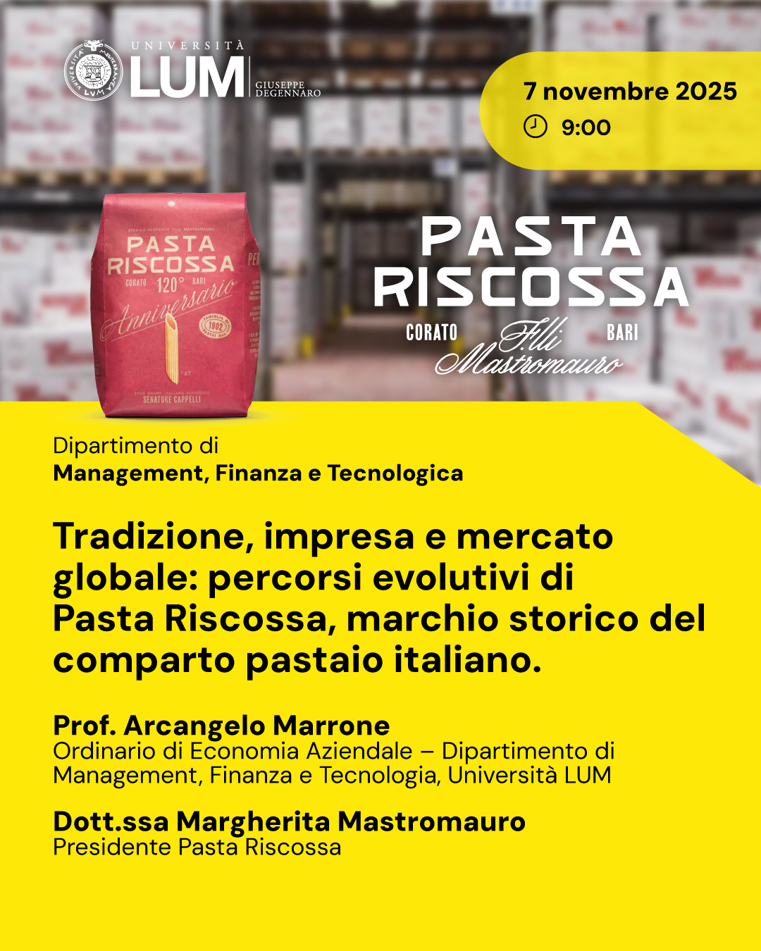 Venerdì 7 novembre 2025, alle ore 9:00 si terrà l’incontro “Tradizione, impresa e mercato globale: percorsi evolutivi di Pasta Riscossa”, organizzato dal Dipartimento di Management, Finanza e Tecnologia dell’Università LUM.