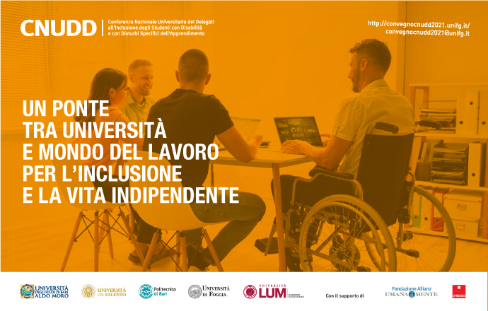 Il prossimo 25 ottobre si terrà il Convegno online “UN PONTE TRA UNIVERSITÀ E MONDO DEL LAVORO PER L’INCLUSIONE E LA VITA INDIPENDENTE” promosso dalla Conferenza Nazionale Universitaria dei Delegati alla Disabilità e organizzato dalle 5 Università pugliesi. All’evento è stata conferita la Medaglia del Presidente della Repubblica per il suo alto valore sociale e culturale.