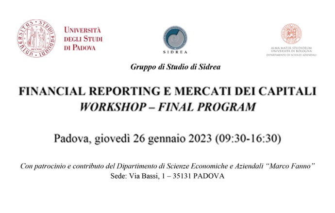 Nell’ambito del workshop Financial Reporting e mercati dei capitali promosso dal gruppo di studio SIDREA, con l’Università degli Studi di Padova e l’Università di Bologna Alma Mater Studiorum, in programma a Padova il 26 gennaio 2023, i Proff Elbano de Nuccio, Arcangelo Marrone, Nicola Raimo, Filippo Vitolla, dalla Prof. Lara Oliva (Università del Molise) e dal phd student Vincenzo Pontrelli hanno presentato research proposal dal titolo: “OIC 8, Quote di emissione dei gas ad effetto serra e costo del debito”.