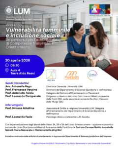 Si terrà il 20 aprile 2026 alle ore 9.30, presso l’Aula 4 della Torre Aldo Rossi dell’Università LUM Giuseppe Degennaro, il workshop dal titolo “Vulnerabilità femminile e inclusione sociale”, promosso dal Dipartimento di Scienze Giuridiche e dell’Impresa.