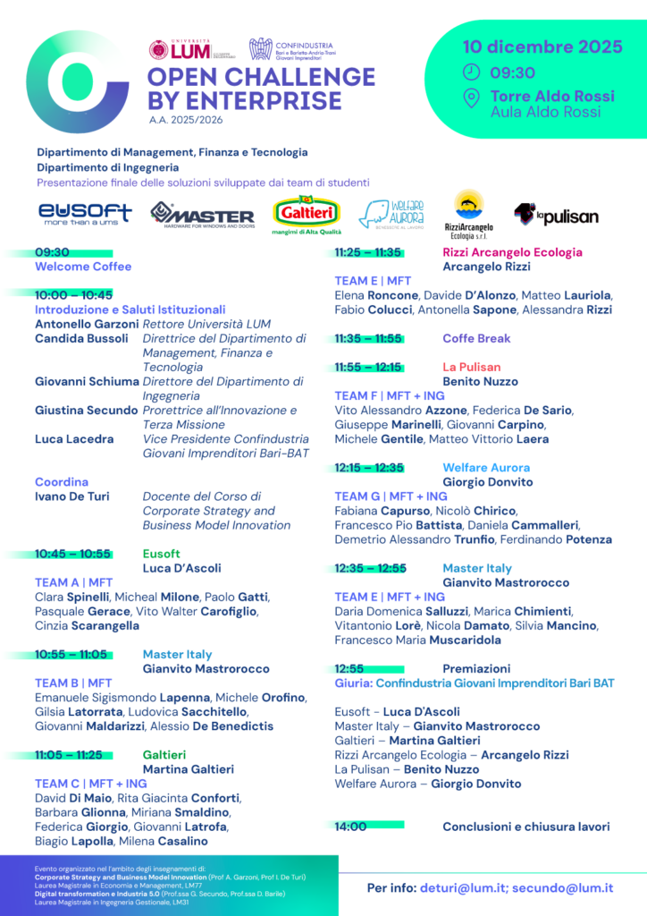 Martedì 10 dicembre 2025, dalle 10:00 alle 14:00, l’Aula Aldo Rossi (Torre Rossi) dell’Università LUM ospiterà il Workshop Finale dell’Open Challenge by Enterprise, un appuntamento che vedrà i team di studenti dei corsi magistrali impegnati a presentare le soluzioni progettate per le imprese coinvolte nell’iniziativa.